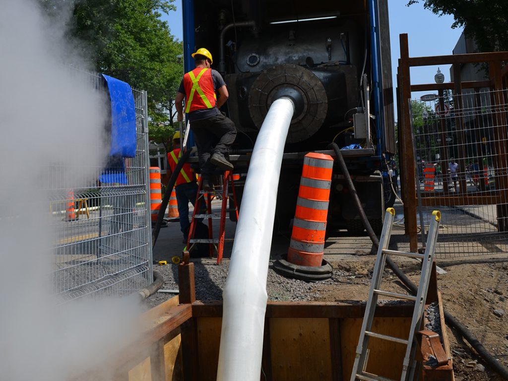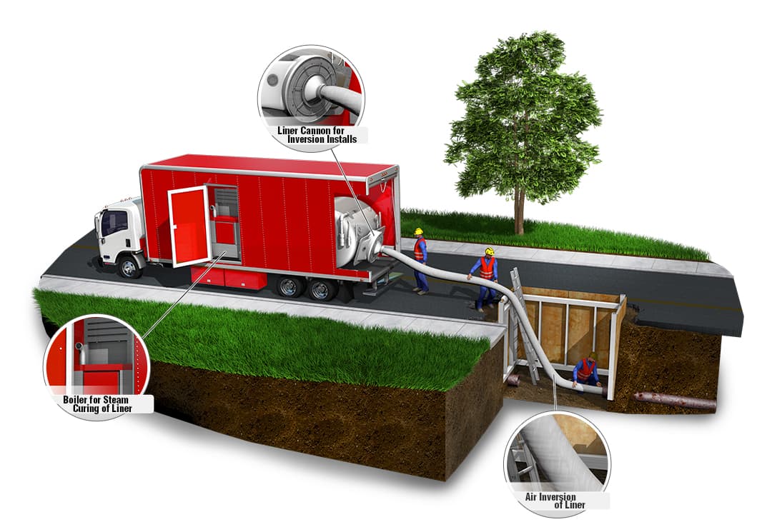 The host pipe is cleaned to allow for proper installation and optimum hydraulic performance of the lined pipe. Water jetting and mechanical cleaning devices are used for cleaning depending on the host pipe condition. Curing is performed using either controlled steam, normally after installation with pressure drum; or, hot water, normally after installation with hydrostatic water column.